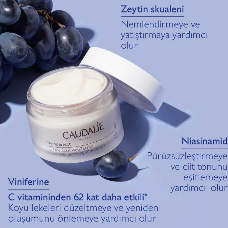 Gündüz bakım kremi Viniferine ve niasinamid yönünden zengin formülüyle lekelerin görünümünü azaltmaya, anında ışıltılı bir görünüm kazandırmaya ve eşit bir cilt tonu sağlamaya yardımcı olur. Tüm cilt tiplerinin kullanımına uygundur. Viniferine 500 ve niasinamid içerir.