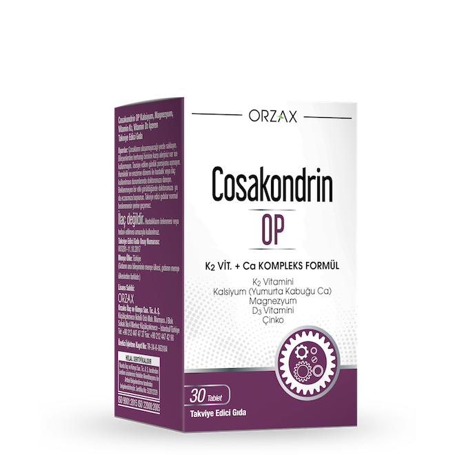 K2 vitamini ile zenginleştirilmiş Cosakondrin OP magnezyum, çinko, D vitamini ve kalsiyum içeren bir gıda takviyesidir.