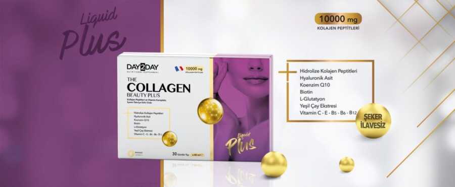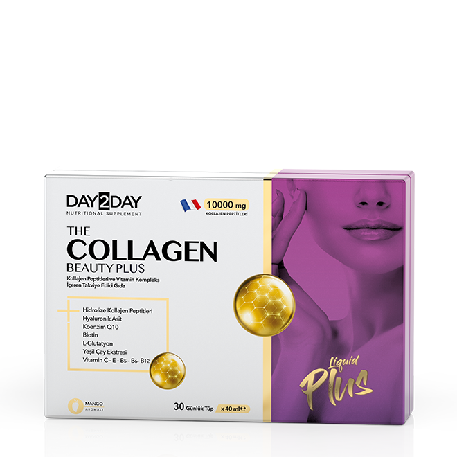 Day2Day The Collagen Beauty Plus 10.000 mg kolajen peptit, hyaluronik asit, glutatyon, koenzim q10, yeşil çay, vitamin ve mineral kompleks içeren likit yapıda içilebilir gıda takviyesidir. Day2Day The Collagen Beauty Plus içerisinde sığır kaynaklı tip I kolajen bulunur. Molekül ağırlığı 2kda=2000 daltondur.