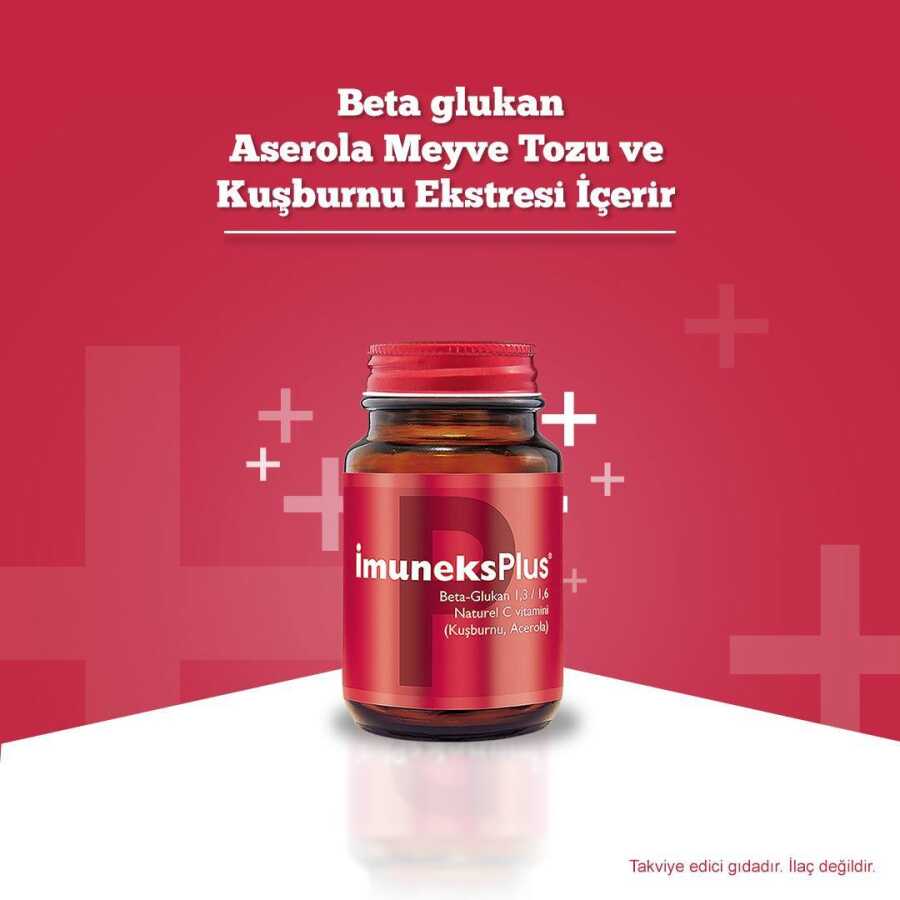 İmuneksPlus Beta Glukan 1,3/1,6 Aserola Meyve Tozu ve Kuşburnu Ekstresi içeren takviye edici gıdadır.