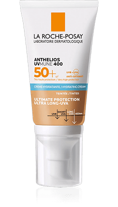 Anthelios UVMUNE 400 50+ renkli hassas cilt güneş kremi, cildi 400 nm'ye kadar ultra uzun UVA ışınlarından koruyan yeni MEXORYL400 filtresini içerir.