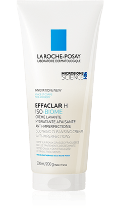 Effaclar H ISO-BIOME Soothing Anti-Blemish Moisturizing Cleansing Cream, şiddetli akne için terapötik tedavilerle zayıflamış kuru ciltler için tasarlanmış bir yüz temizleyicidir . Anti-inflamatuar Aqua Posæ Filiformis, onarıcı Niacinamide ve cilt mikrobiyomunun dengesini geri kazanmaya yardımcı olan yatıştırıcı La Roche-Posay Termal Su ile sabunsuz formüle edilmiştir. Kusurlu kuru ciltler için bu yüz temizleyici nazikçe temizler ve arındırır, cildi temiz ve rahat bırakır.