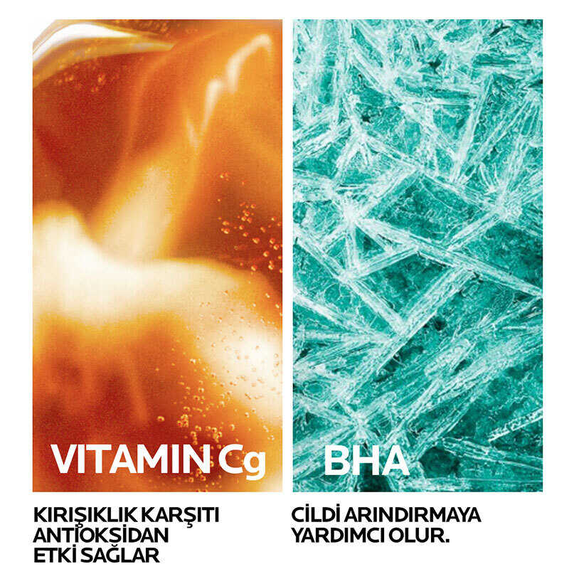 Cilt parlaklığını artırması ve yaşlanma belirtilerini önlemesiyle bilinen Cg vitamini ve hücre yenilenmesini hızlandırması ve ciltteki fazla yağı azaltmasıyla bilinen BHA ile formüle edilmiştir.