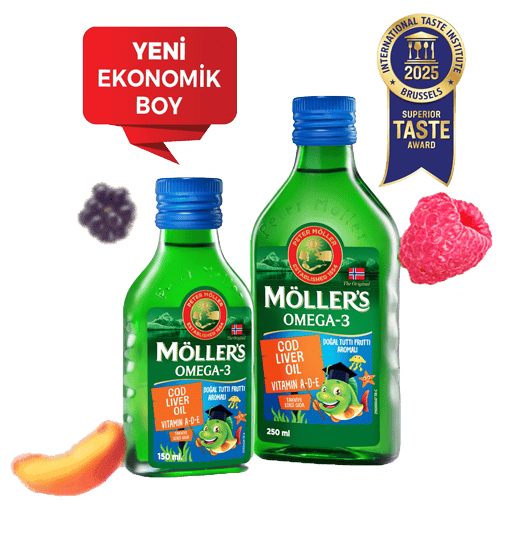 Möller’s Omega-3 sıvı formu doğal tutti frutti aromalıdır. Şeker, tatlandırıcı, koruyucu ve domuz ürünleri içermez.