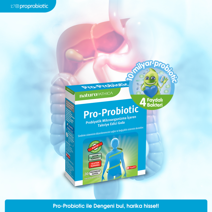 Pro-Probiotic 4 farklı probiyotik ve 10 milyar mikroorganizma ile normal mikrobiyotanın korunmasına katkı sağlar.