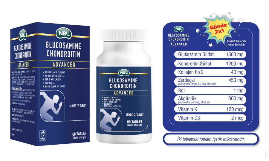 Glukozamin 1500 mg Kondroitin 1200 mg Kollajen tip 2 40 mg Zerdeçal (Curcuma longa L.) kök ekstresi 450mg Akgünlük (Boswellia serrata) ekstresi 300 mg içrmektedir.