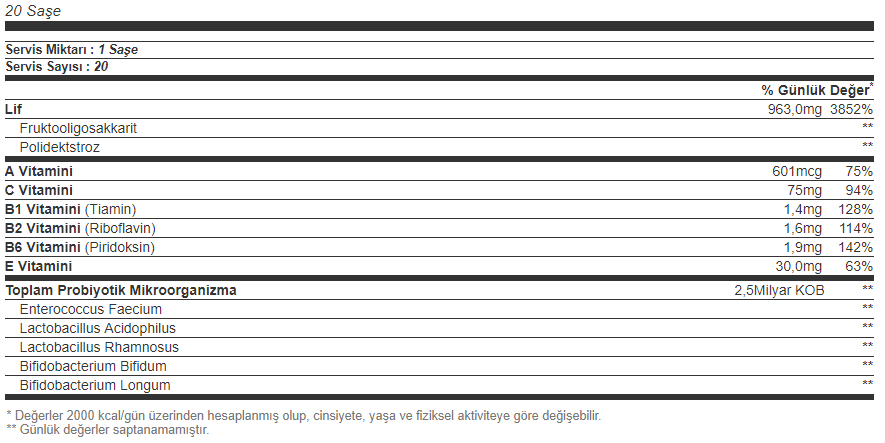 probiyotik mikroorganizma, lif ve vitamin içeren takviye edici gıda