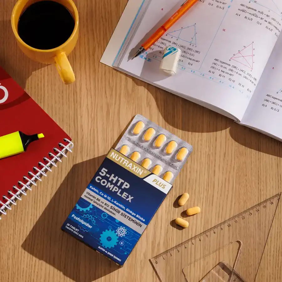Nutraxin 5-HTP Complex; Kafein, Ginkgo Biloba Ekstresi, 5-HTP, Magnezyum, Fosfolipitler, CoQ-10, L-Karnitin, Çinko, B6 ve B12 vitamini ayrıca Üzüm Çekirdeği ve Biberiye Yaprak Ekstresi içerir.