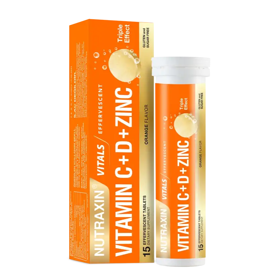 Nutraxin Efervesan Vitamin C+D+ ZINC; içeriğinde bulunan C vitamini , D vitamini ve çinko ile üç güçlü bileşeni bir arada sunmaktadır. Efervesan formda olup, portakal aromalıdır.