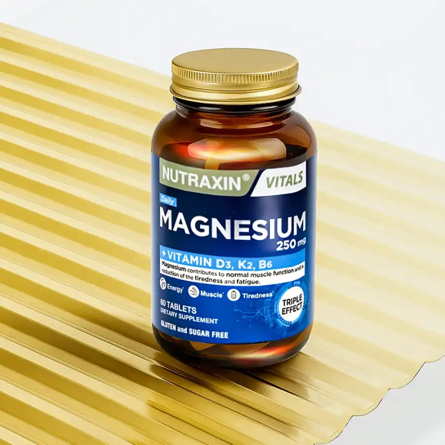 Nutraxin Magnesium Daily, her tablette 125 mg elementel magnezyum minerali, D3K2 ve B6 vitamini içerir.