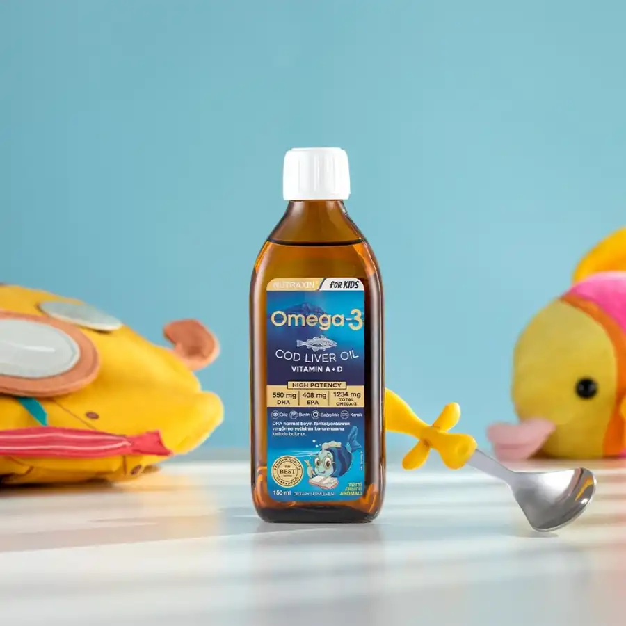Nutraxin Omega -3 for KIDS, 550 mg DHA, 408 mg EPA, 276 mg diğer omega -3 yağ asitleri ve E, A, D vitaminleri içerir. Ağır metallerden uzak, temiz ve soğuk sularda yaşayan, morina karaciğeri yağından elde edilmiştir.