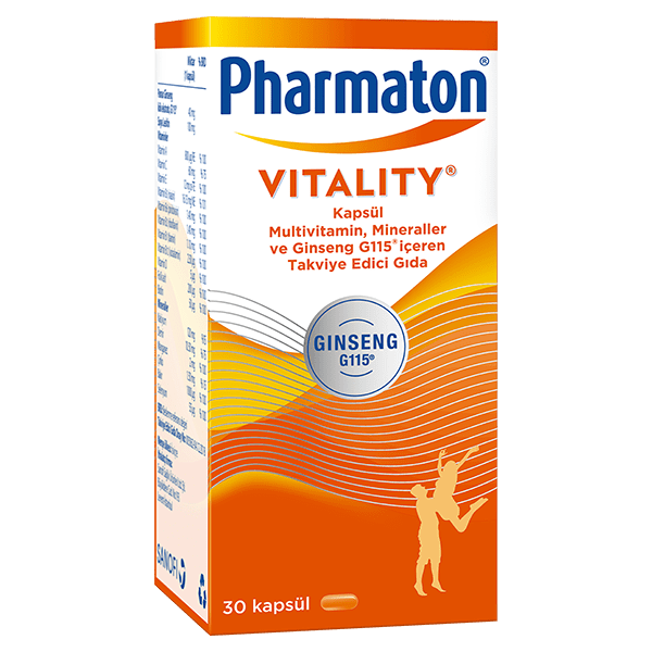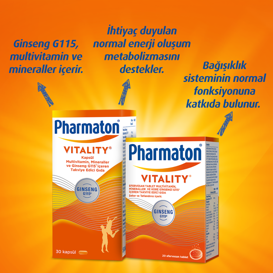 Pharmaton® Vitality, etkinliği klinik olarak kanıtlanmış Ginseng G115®, 11 Vitamin ve 6 Mineral içeren Takviye Edici Gıdadır. Etkinliği 30’un üzerinde yapılan klinik çalışmalarla kanıtlanan Ginseng G115® ile yoğun ve stresli yaşam temposunda konsantrasyonu destekler. İçeriğinde bulunan A, C, B12, D vitaminleri ve Demir, Çinko, Bakır, Selenyum, bağışıklık sisteminin normal fonksiyonuna katkıda bulunur. İçeriğindeki C, B3, B6, B2, B1, B12 vitaminleri ve Biotin, Kalsiyum, Demir, Mangenez, Bakır ile normal enerji oluşum metabolizmasına katkıda bulunur. İçeriğindeki C, B3, B6, B2, B12 vitaminleri ve Folik Asit, Demir yorgunluk ve bitkinliğin azalmasını destekler.
