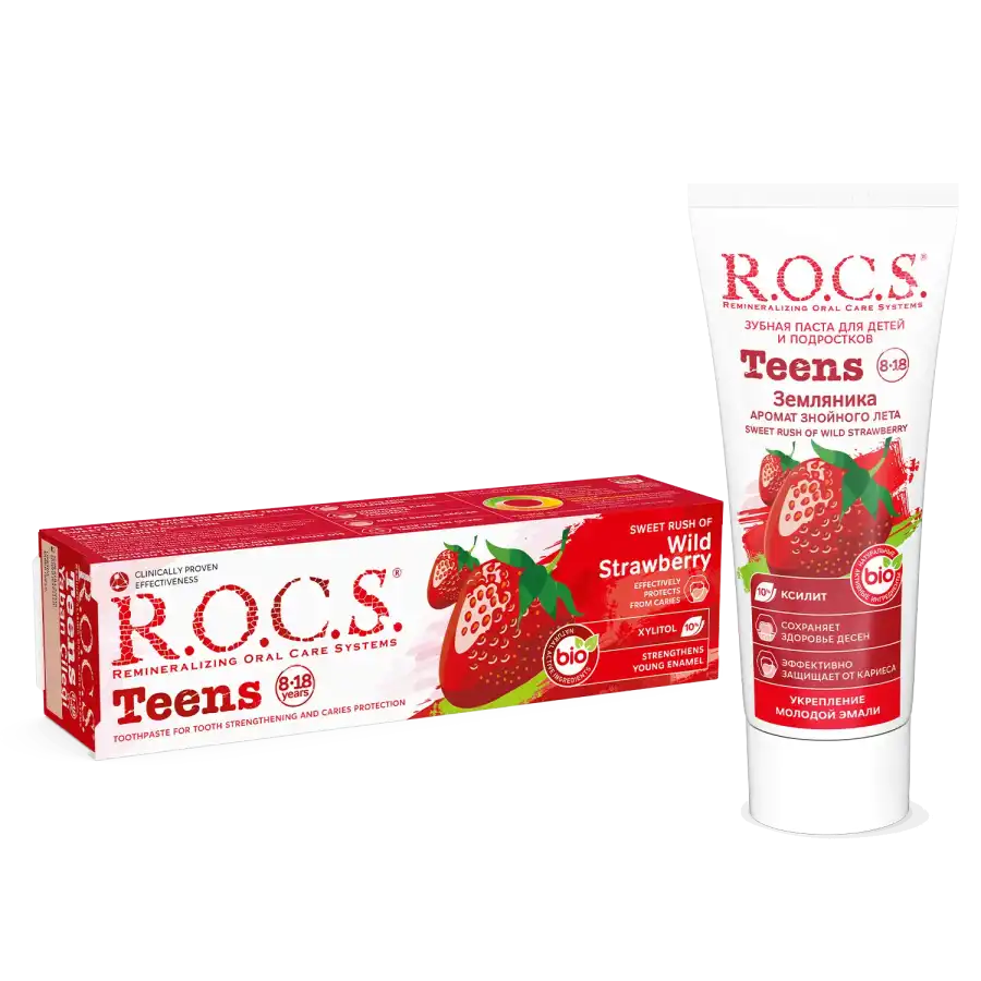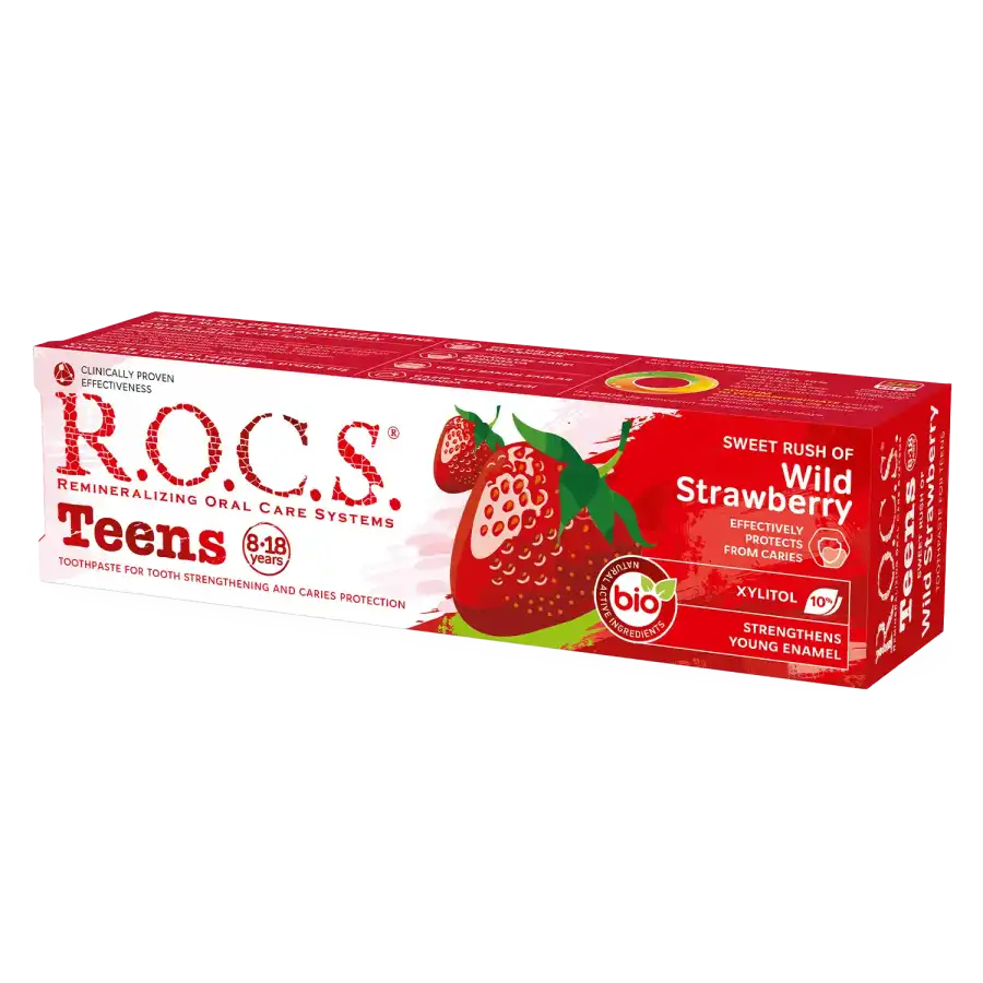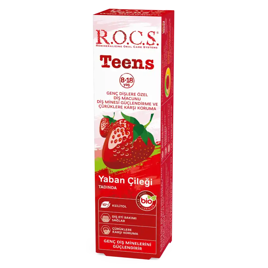 Okul çağındaki çocuklar ve gençler ebeveyn kontrolünün azalması ile diş çürükleri ve diş eti rahatsızlıklarıyla karşılaşırlar. Bu dönemde diş minesi florür ve ksilitol içeren diş macunları ile desteklenebilir. R.O.C.S. Teens 8-18 Yaş diş macununun içerisinde Amifluour®, aminoflorid ve ksilitol kombinasyonudur. Amifluor® kompleksi hızla (20 saniye içinde) diş minesi üzerinde koruyucu bir tabaka oluşturarak, dişleri çürüklere karşı korur ve ağız içinde çürüklere yol açan bakterileri engellemeyi hedefler. Düşük aşındırıcı içerir (RDA=50) ve diş dokularına zarar vermeden temizlemeye yardımcı olur. Yaşa göre düzenlenmiş florid konsantrasyonu içerir (900 ppm).