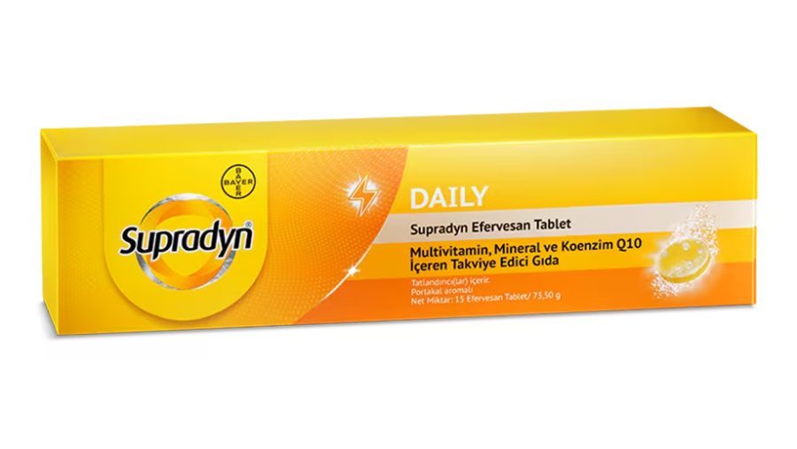Supradyn® yoğun yaşamınızda aktif kalmanıza yardımcı olur. İçeriğindeki B1, B2, B5, B6, B7, B12, C vitaminleri ve Demir, Kalsiyum, Bakır, İyot, Magnezyum, Mangan ile normal enerji oluşum metabolizmasına katkıda bulunur. İçeriğindeki B2, B3, B5, B6, B9, B12, C vitaminleri ve Demir, Magnezyum ile yorgunluk ve bitkinliğin azalmasına katkıda bulunur.