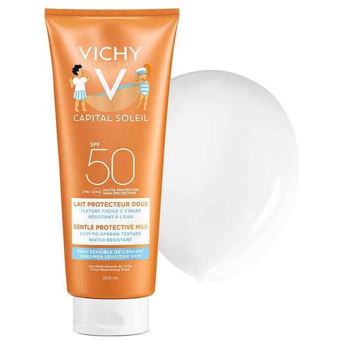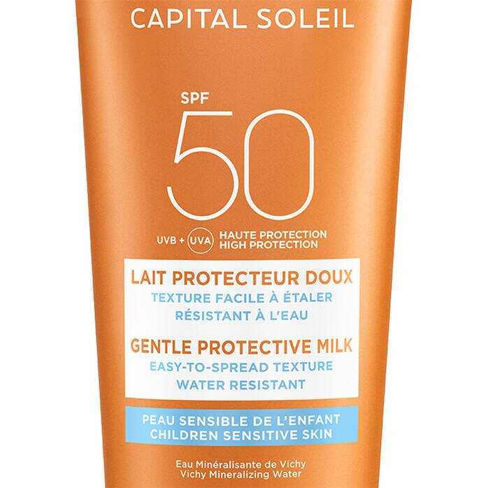 Capital Soleil Çocuk Yüz ve Vücut Nazik Sütü SPF 50+, yağlı olmayan bir dokuya sahiptir ve Hyaluronik Asit ile zenginleştirilmiştir. Uygulaması kolaydır ve beyaz iz bırakmaz. Aileler için ideal olan formül, Mexoryl® bazlı, fotostabil, geniş spektrumlu UVA ve UVB filtreleme sistemi ile yatıştırıcı Vichy Mineralli Termal Suyu içerir.