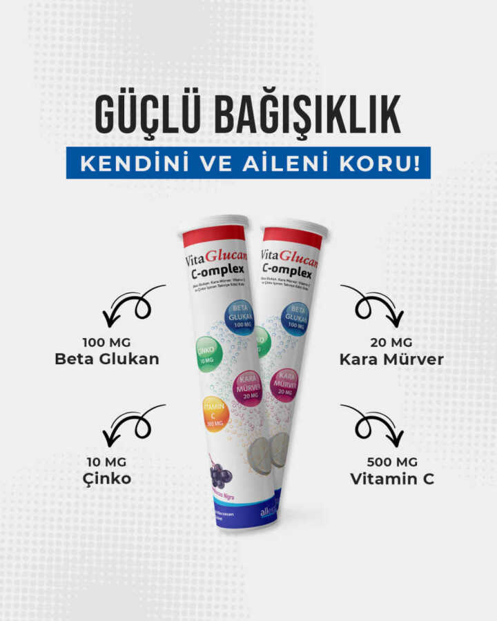 Allergo VitaGlucan C-omplex, içeriğinde C vitamini, Beta glukan, Sambucus nigra ve Çinko bulunan takviye edici bir gıdadır. İçeriğinde bulunan,